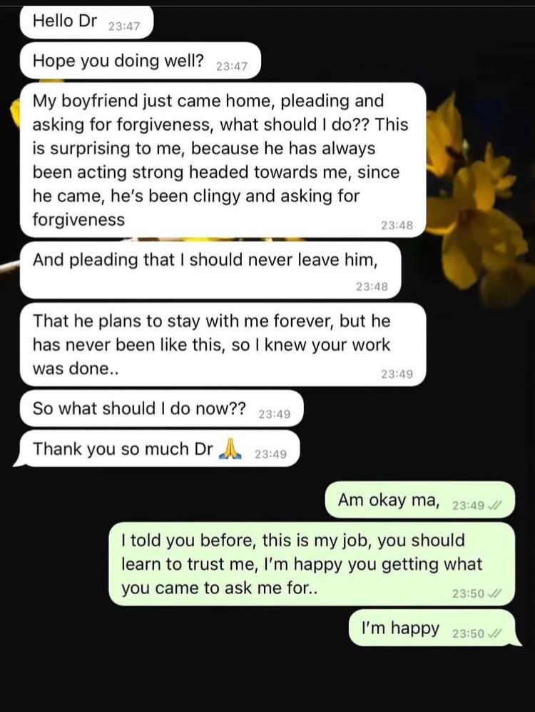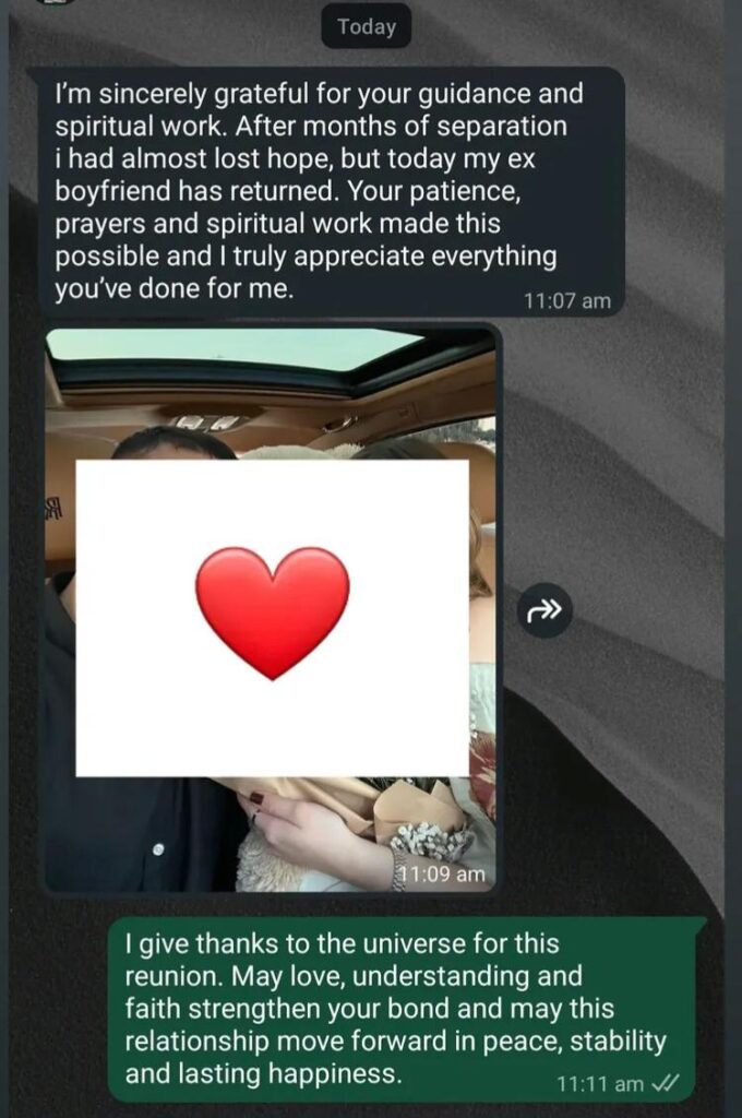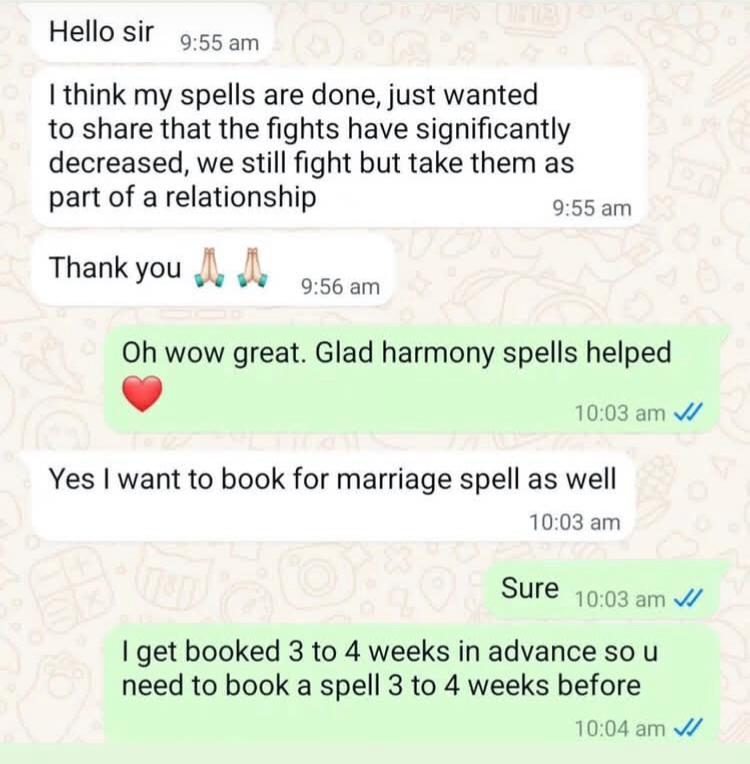 My partner and I were married for 12 years and seem to have the perfect relationship. I got a great job opportunity that required a lot of traveling, which meant spending hardly any time at home. While work was great. My husband started getting lonely because I was spending less and less time with him. he happened to connect with an old girlfriend, who always played with his emotions before we met. And knew that this person was toxic for him, but always managed to pull him in. When I would return home for the weekends, I noticed he was extremely distant and not as excited to see me as he usually was the first few times. I just chalked it up to him, trying to adjust to everything, but then noticed that it was getting worse and worse I tried talking to him. he would not communicate one day I happened to see his phone left on the kitchen counter with a flirty text message from her. Then I realized it all made sense as to why he was so distant. I confronted him, and he simply said that they are friends and nothing more but I knew that that wasn't true and he had told me many times before that this person always managed to get him vulnerable. he also told me maybe we should consider a break which left me absolutely devastated. I happened to stumble upon Chief biddo's website searching for some type of solution, knowing that this person was bad for him. I told Biddo my situation, and he had done a reading to see if my husband still had legitimate feelings for me. Turns out he was being manipulated by this other person which had happened before Biddo told me there was no connection between them and he really did love me and we did a love ritual very shortly after I started working with Biddo him and I had a long talk and he told me that he does still love me and wanted to work things out and stopped communicating with that other person for good. We are now very happy and I feel secure in my relationship. Thanks to Biddo and what he did for me.